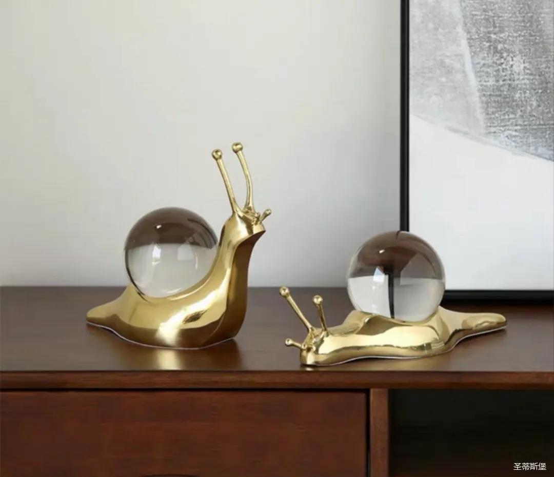 在黄铜材质上勾勒出蜗牛流畅的肌肉线条,描摹蜗牛攀爬蠕动与站立眺望的姿态,加上触须伸缩,丰富而逼真的细节制作,生动有趣。